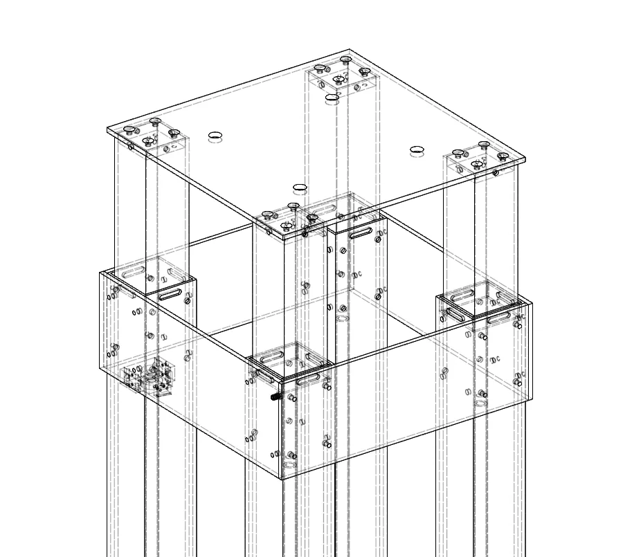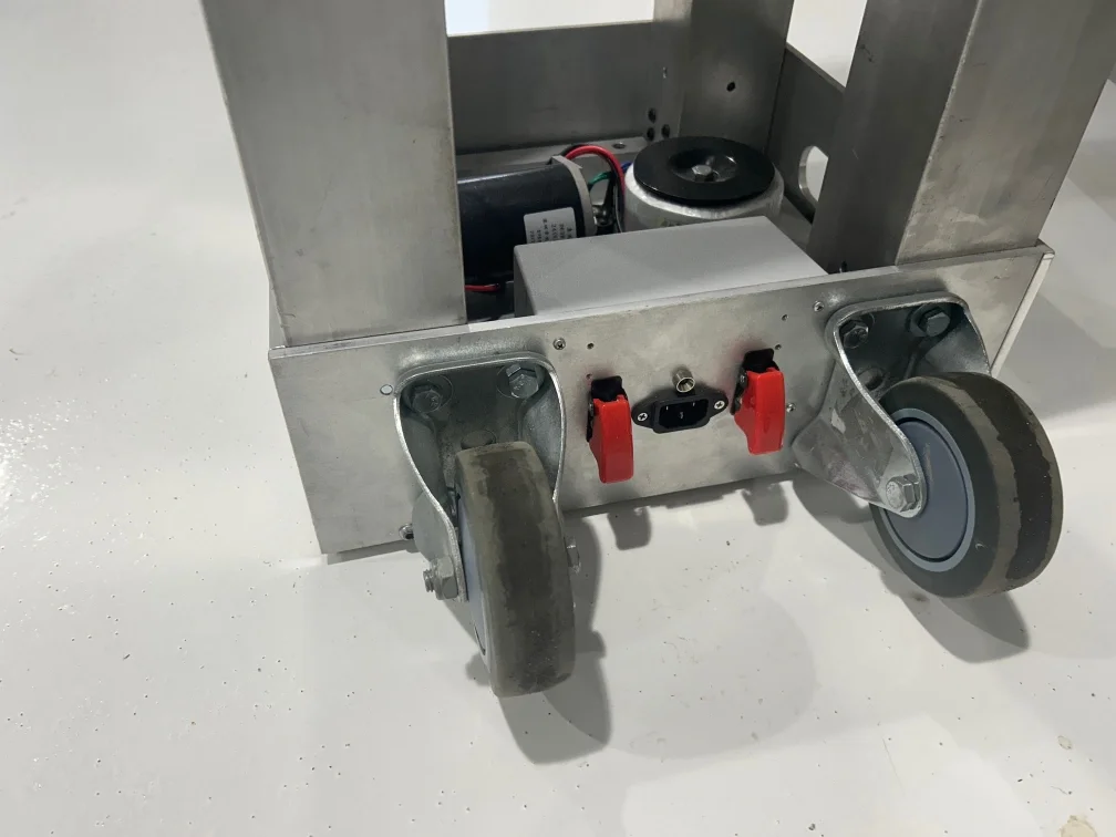 The lift uses 4 ball screws to smoothly elevate a payload of up to 200 pounds from about 4 feet to 7 feet in the air. Under normal operation, the lift is bolted to a large base plate, which aids in stability. The lift was designed to be very rigid and stable, even at maximum extension.